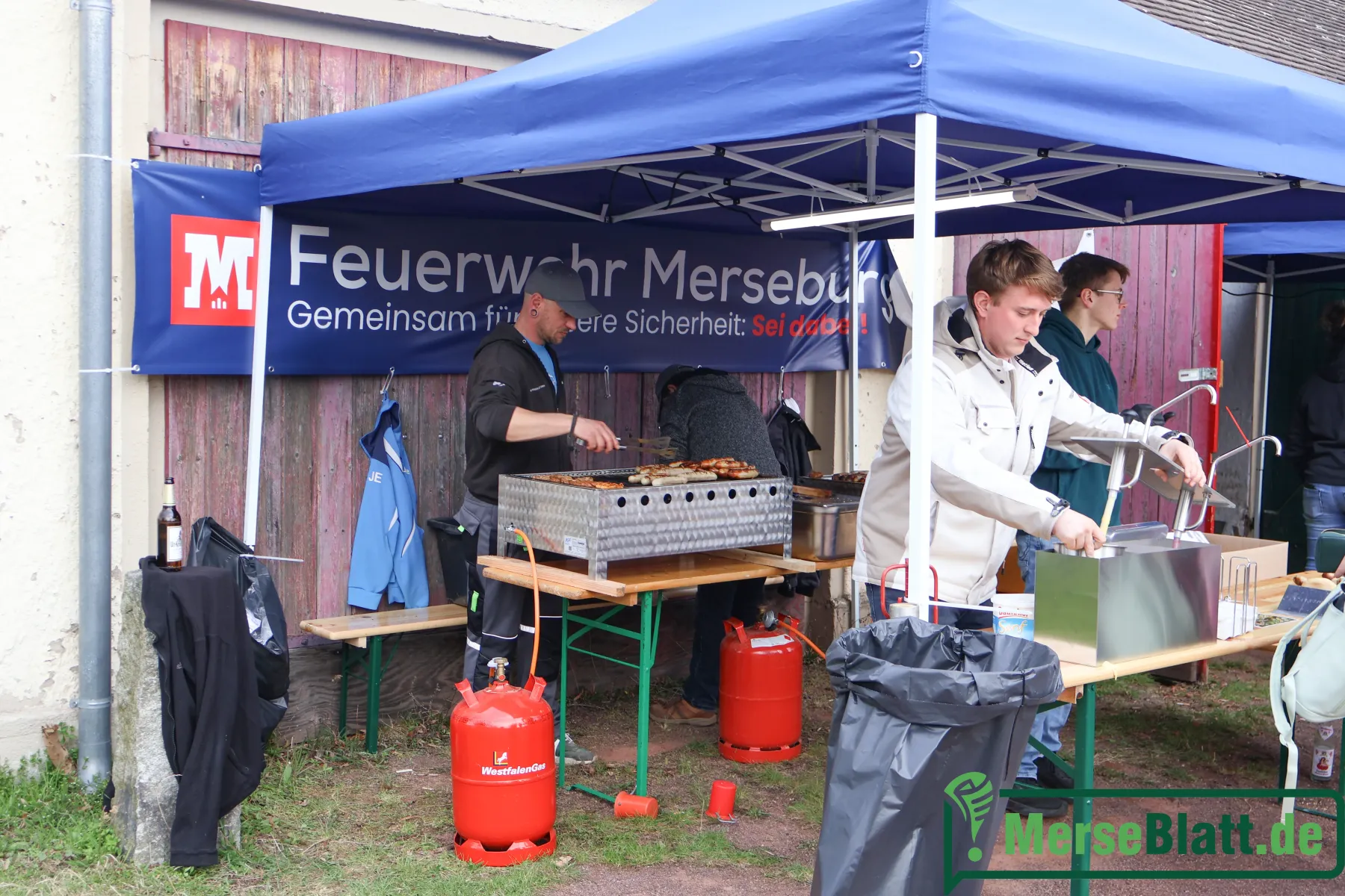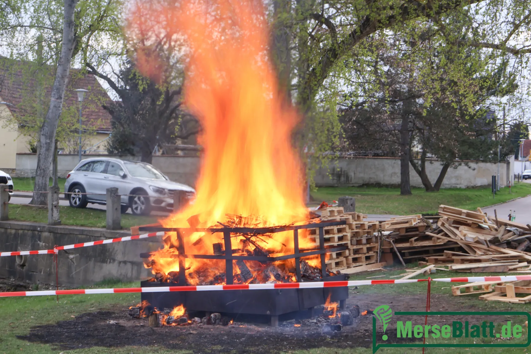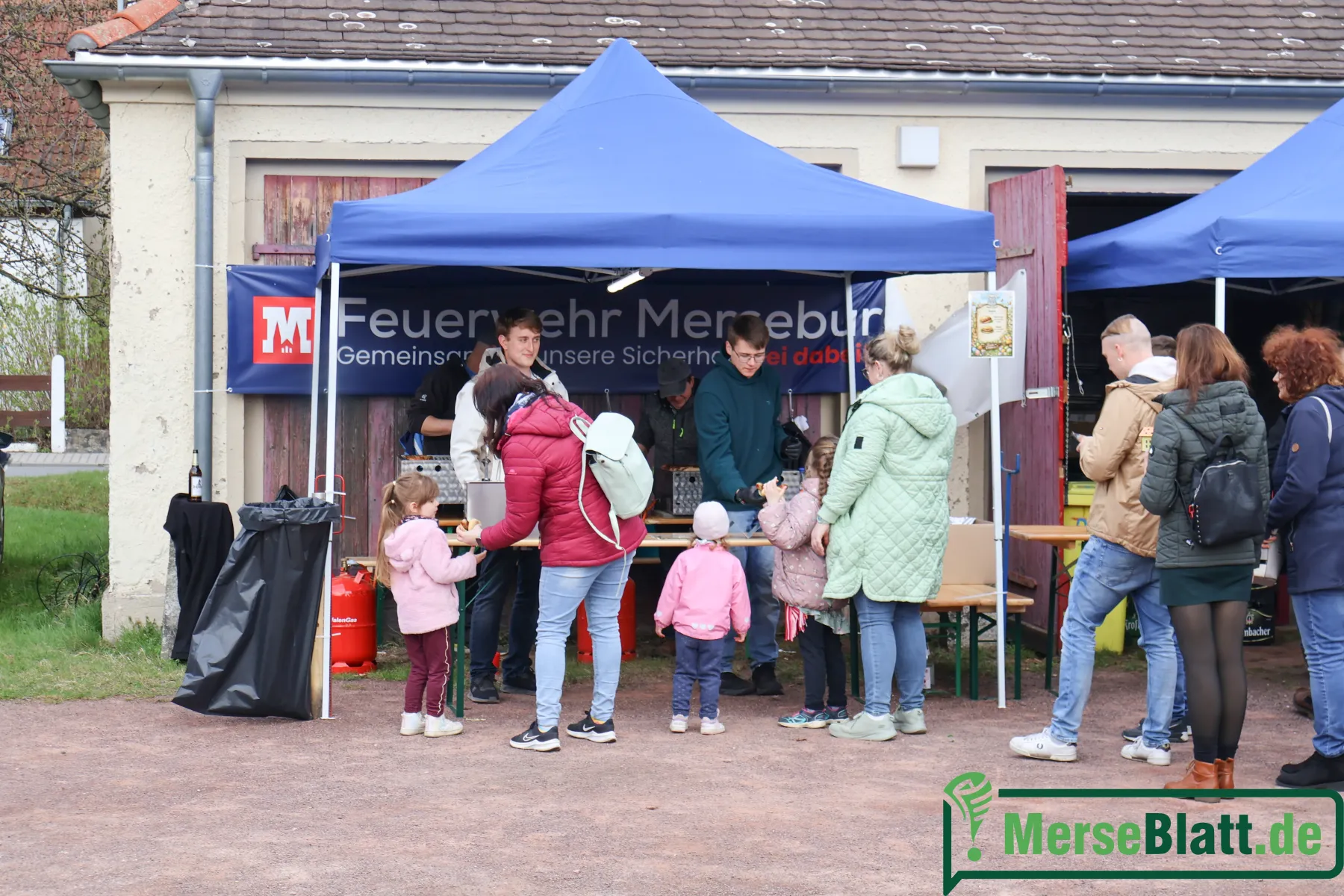 Danach zog es die Besucher zum alten Meuschauer Feuerwehrhaus – und damit wieder zurück an den Dorfteich. Dort knisterte das Osterfeuer schon vor sich hin, und über dem Gelände lag der Duft von Bratwurst und Steak. Die Feuerwehr Merseburg stand am Grill – und kam kaum hinterher. Die Schlange wurde länger, die Stimmung blieb gut. Wer anstand, quatschte eben mit dem Nachbarn. Dazu ein Bier, ein Sekt, für die Kinder eine Limo. Die MeuschauerMinis e.V. hatten nebenan eine Bastelstraße aufgebaut, an der sich die Kleinen nach der Eiersuche austoben konnten.