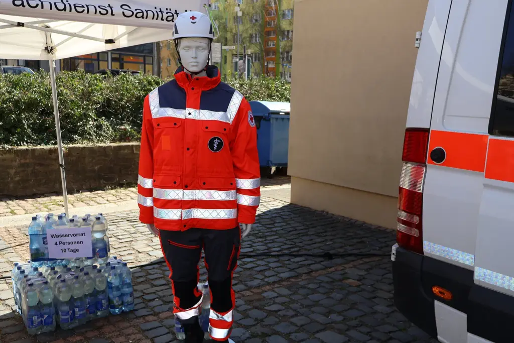 Neben der Stadtwache selbst gab es auf dem Markt noch einiges zu entdecken. Am Stand des Deutschen Roten Kreuzes, Fachdienst Sanität des Katastrophenschutzes Saalekreis, wurde es ganz praktisch. Wie viel Wasser braucht eine vierköpfige Familie für zehn Tage? Was sind Einmannpackungen? Und was gehört wirklich in einen Notfallrucksack? Gezeigt wurden unter anderem ein Taschenmesser, Verbandszeug und ein solarbetriebenes Handradio mit Kurbelfunktion. Eine Minute drehen erzeugt dabei rund vier Minuten Strom für den Radioempfang. Wer wollte, konnte außerdem einen Rettungswagen von innen besichtigen und sich alles erklären lassen.