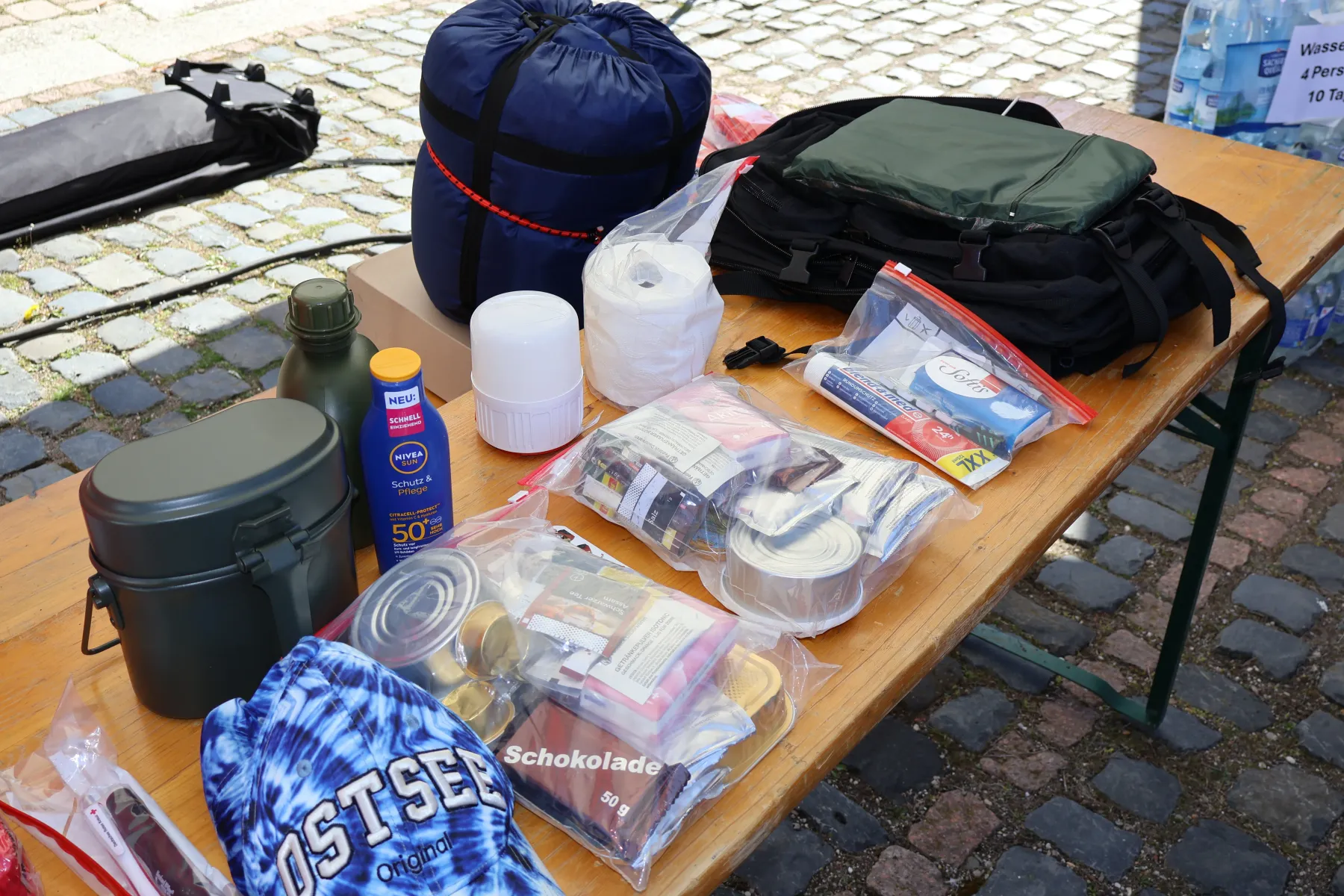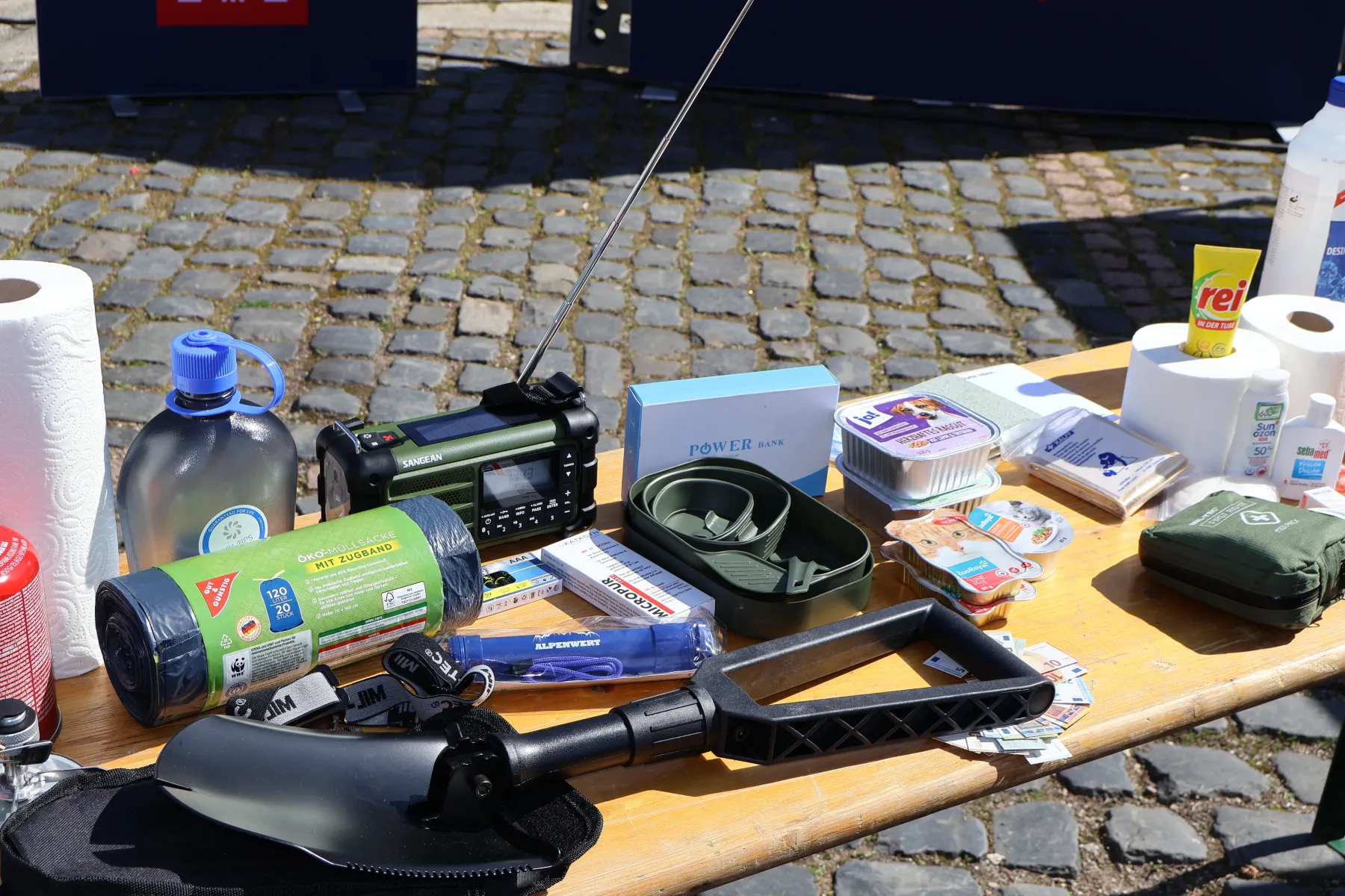 Neben der Stadtwache selbst gab es auf dem Markt noch einiges zu entdecken. Am Stand des Deutschen Roten Kreuzes, Fachdienst Sanität des Katastrophenschutzes Saalekreis, wurde es ganz praktisch. Wie viel Wasser braucht eine vierköpfige Familie für zehn Tage? Was sind Einmannpackungen? Und was gehört wirklich in einen Notfallrucksack? Gezeigt wurden unter anderem ein Taschenmesser, Verbandszeug und ein solarbetriebenes Handradio mit Kurbelfunktion. Eine Minute drehen erzeugt dabei rund vier Minuten Strom für den Radioempfang. Wer wollte, konnte außerdem einen Rettungswagen von innen besichtigen und sich alles erklären lassen.